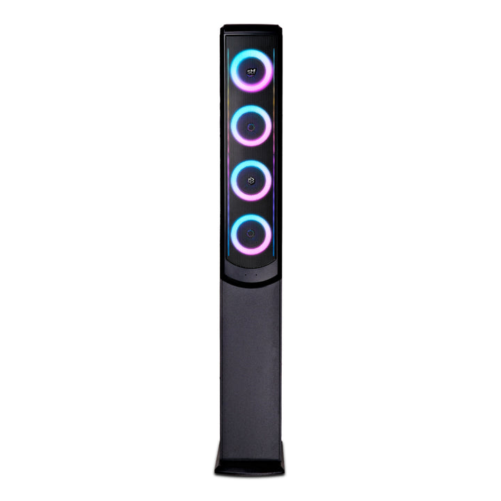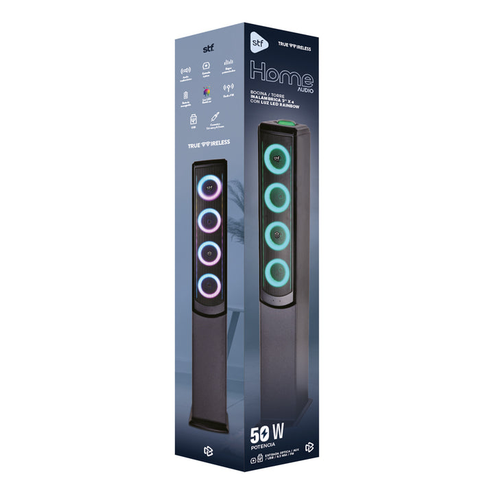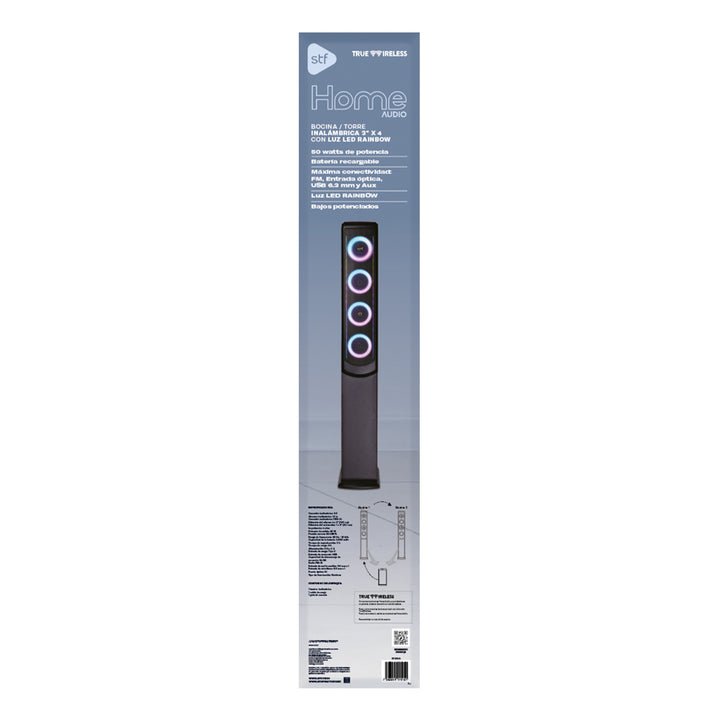 Eleva el ambiente de cualquier espacio con la Torre de Sonido Inalámbrica 50W con Woofer de 5” y Luz LED RGB, diseñada para ofrecer audio potente, funciones versátiles y un estilo visual que transforma cada momento.