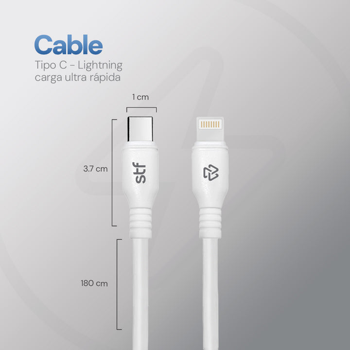 Carga y sincroniza tus dispositivos de manera eficiente con el cable Tipo C a Lightning de STF en color blanco. Con una longitud de 1.8 metros, este cable te brinda la flexibilidad que necesitas para conectar a un cargador o computadora en cualquier lugar.