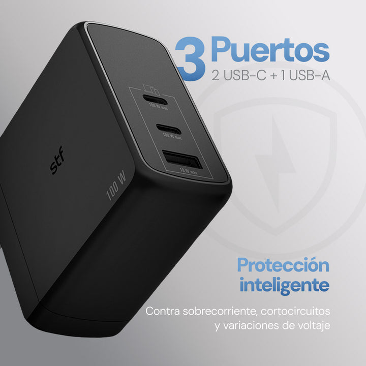 Experimenta la máxima velocidad y versatilidad de carga donde vayas con el cargador de pared GaN de 100W de STF. Equipado con 2 puertos Tipo C que ofrecen una increíble potencia Power Delivery (PD) de hasta 100W y 1 puerto USB compatible con Quick Charge (QC), este cargador es la solución definitiva para alimentar rápidamente laptops, tablets, smartphones y otros dispositivos, ¡incluso simultáneamente!