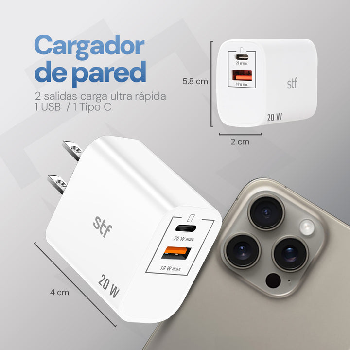Carga tus dispositivos de forma rápida y eficiente con el cargador de pared de doble salida STF . Equipado con un puerto Tipo C y un puerto USB, este cargador te permite alimentar dos dispositivos simultáneamente. Ambos puertos ofrecen una carga ultra rápida de hasta 3A (20W), asegurando que tus smartphones, tablets y otros dispositivos se carguen en menos tiempo.