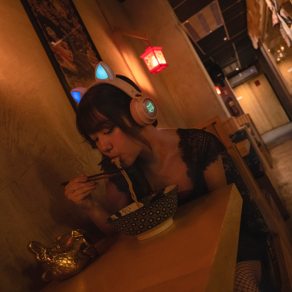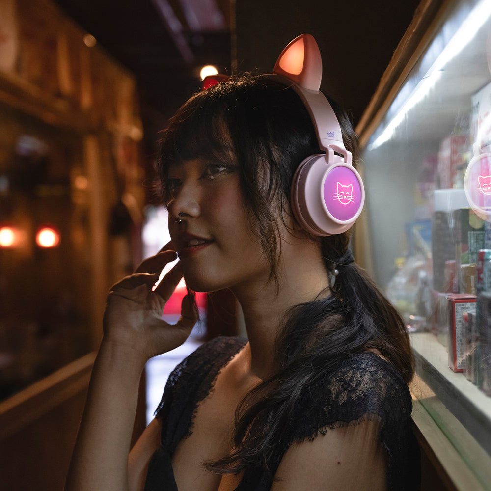 ¡Konnichiwa! Audífonos Katu, para las personas que disfrutan de escuchar y bailar sus canciones favoritas durante horas. Tienen luz LED en las orejas que se encienden en diferentes colores, un micrófono integrado para que puedas contestar tus llamadas, un lector microSD y la duración de la batería es de hasta 5 horas de uso; si se te agota, su función dual te rescatará de cualquier apuro, conecta un cable de 3.5mm para que no pares de escuchar tus canciones favoritas.