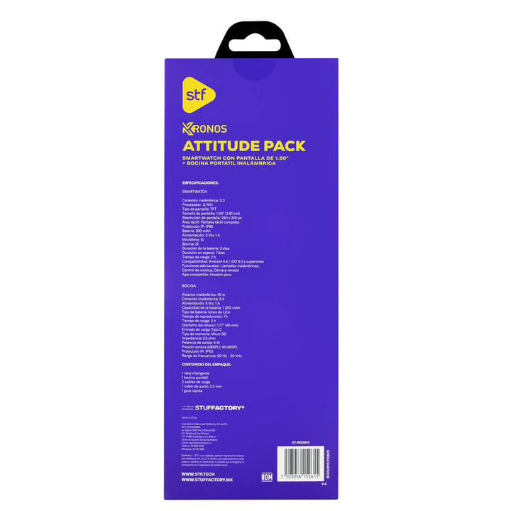 El Kronos Attitude Pack es el dúo perfecto para quienes buscan funcionalidad, estilo y rendimiento. Este set incluye un smartwatch con pantalla táctil de 1.5" y una bocina portátil con gran potencia y autonomía. Ideal para quienes viven conectados y disfrutan cada momento con ritmo.