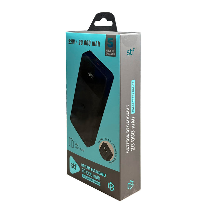 Su gran capacidad de 20,000 mAh te permite cargar tu teléfono varias veces sin interrupciones, haciendo de esta batería portátil el complemento ideal para viajes, trabajo o actividades al aire libre.
