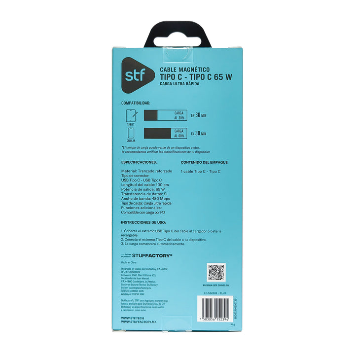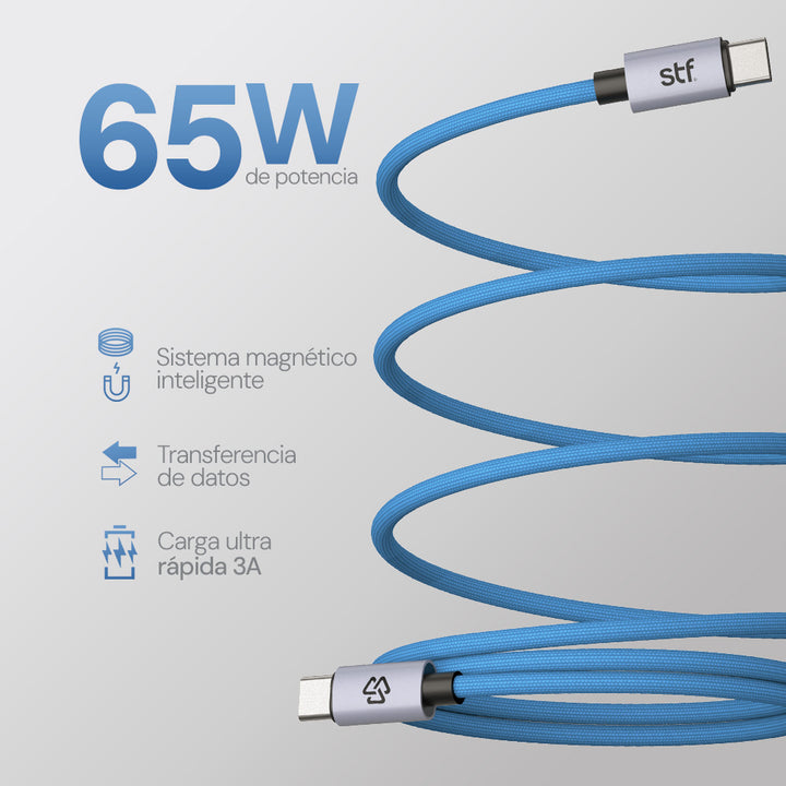 Cable Magnético Tipo C a Tipo C: Carga Rápida, 65W, Transferencia de datos, Azul