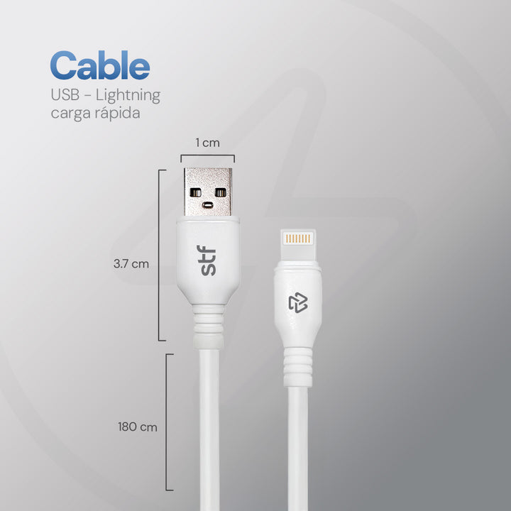 Carga y sincroniza tus dispositivos de manera eficiente con el cable USB a Lightning de STF en color blanco. Con una longitud de 1.8 metros, este cable te brinda la flexibilidad que necesitas para conectar tus dispositivos a un cargador o computadora en cualquier lugar.