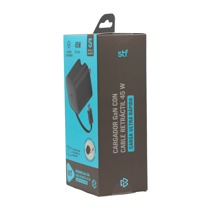 El Cargador STF GaN Retráctil de 45W con Cable Tipo C está diseñado para ofrecer una carga ultra rápida y segura para tus dispositivos, combinando rendimiento avanzado con portabilidad.